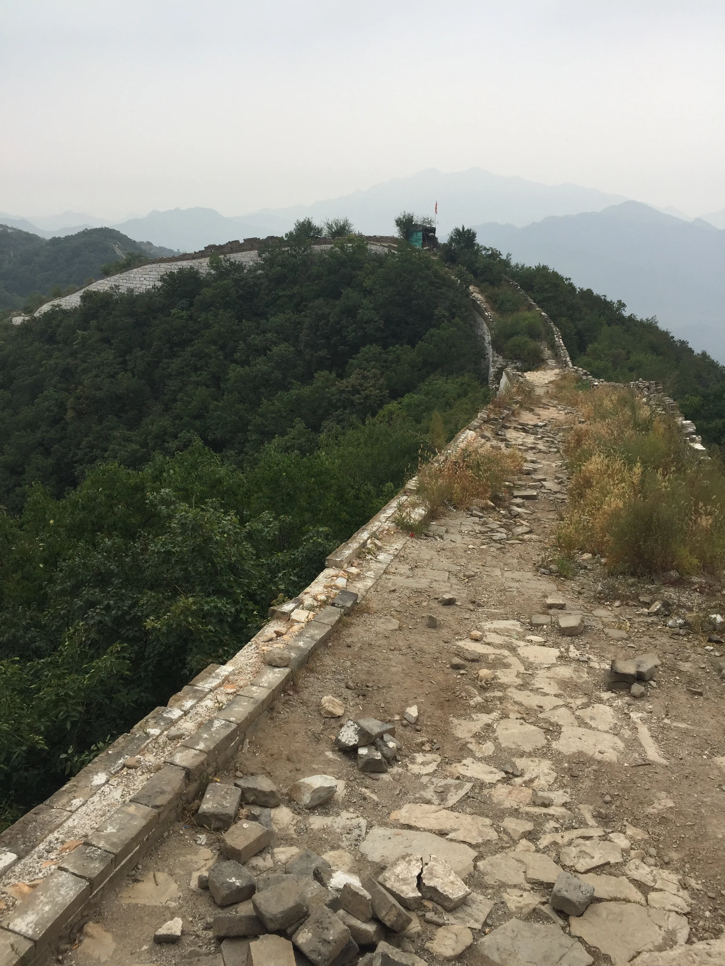 I had to stop several times to catch my breath from the exertion of the hike. I was carrying only a few items in my pack but the heat and humidity, even in the early morning, were taking a toll. As I made it to the summit of the tallest tower (1029 meters), the Wall rounded into a U-turn and took me straight back down the crest of an adjacent mountain. The descent was dizzyingly steep, and impossible to properly capture in a photo. This portion of the wall was in a little better condition, which wasn’t really a help at all since the smooth stones had a thick layer of fine dust that made for a surface as slippery as a newly polished floor. In the first twenty feet of the descent I thought back to my Patagonian guide in Chile explaining to us tricks about steep slope descents and tried to mimic his zig-zagged shuffles, keeping my weight centered over my feet and trying not to lean too far on my heel-side. It was no use, I started skating and sliding down the hill, trying to prevent myself at all costs from somersaulting forwards until finally gravity won and my feet slid out from under me, bringing my weight down hard onto the left side of my leg and crashing my hip into the stones. I didn’t even have time to get a hand out to take some of the fall—maybe this was a good thing since I have more cushion in my rear than I do strength in my wrist. I was shaken, hurt. I couldn’t help it—my legs were now trembling from the adrenaline and the pain. I could tell that this fall could have been worse, and that I was going to be OK, but my confidence was plummeting and I began worrying about the other 500+ meters below me that offered the same terrain.