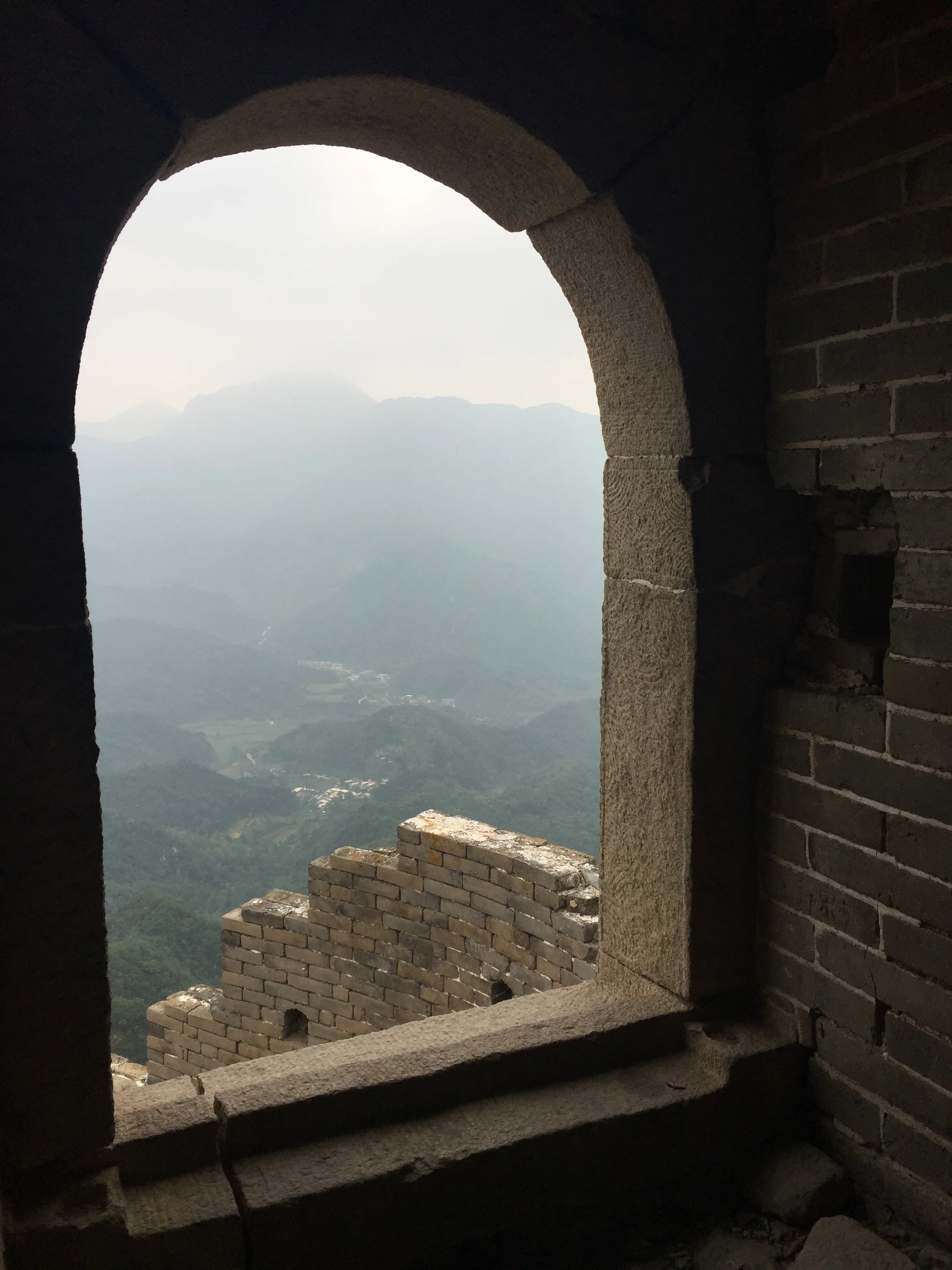 My guide held the loose blocks from slipping out under my feet as I made the climb up two piles of these makeshift steps. When I chartered this guide, I wasn’t really aware that this was how we would be making our entrance. He got me safely up to the first tier and then made his climb, declining my outstretched hand and making it look easy. One more level to go—the blocks under the window were shorter than the first tier, meaning he would have to give me his shoulder to boost myself up the final bit. He was by no means a burly platform, and I was suddenly conscious of our size difference. I couldn’t believe the view from that first tower. The Wall stretched on for miles to my left up and down a steep section and zigzagged through the mountains to my right. From here I could see the Jiankou section (meaning “arrow nock” because of its pointed contour following the mountain crests) in its entirety snaking along the lush mountain range. This section was part of the original Ming Dynasty (1368-1644).
